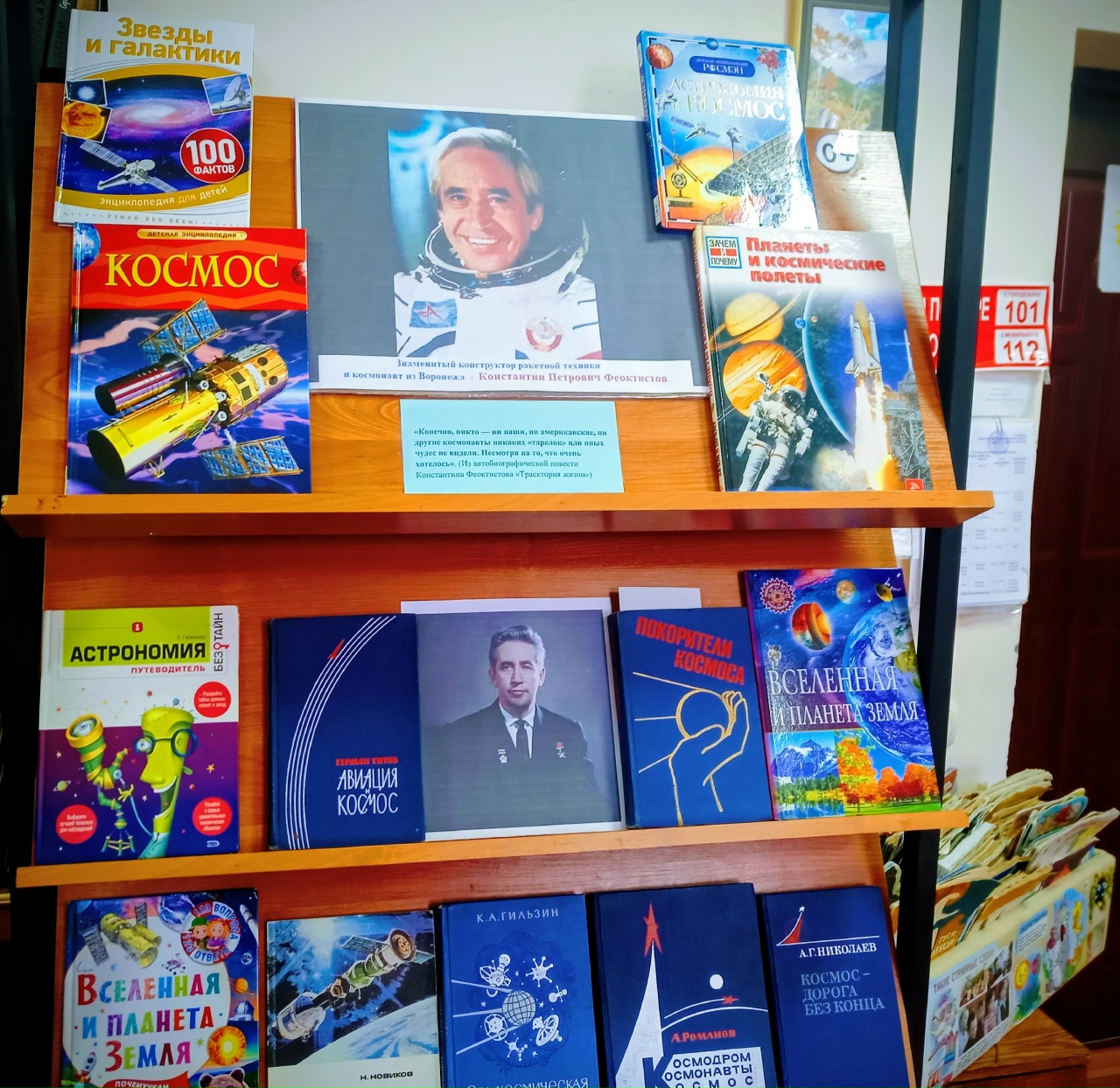 Библиотекарь Елань - Коленовской модельной библиотеки МКУК «Новохопёрская ЦБС» к этой знаменательной дате  подготовил тематическую выставку о знаменитом земляке «Знаменитый конструктор ракетной техники и космонавт из Воронежа - Константин Петрович Феоктистов». Константин Феоктистов родился в Воронеже в 1926 году. В годы войны был расстрелян оккупантами и чудом выжил. Участвовал в создании первого искусственного спутника Земли. Руководил проектированием корабля «Восток», был ведущим разработчиком кораблей «Союз» и «Прогресс», орбитальных станций «Салют» и «Мир». Константин Петрович стал первым конструктором, отправившимся в космос на аппарате, который сам же и создал; первым побывавшим в космосе гражданским инженером; членом первого в истории освоения космоса группового экипажа, впервые вышедшего на околоземную орбиту без скафандров. Лауреат Государственной премии СССР (1966, 1976), Герой Советского Союза. Феоктистов Константин Петрович Почётный гражданин городов Калуги и Воронежа. На выставке представлены издания о космосе, об истории развития космической отрасли, книги из серий «Космос. Полная энциклопедия», «Астрономия и космос» и другие. Особое место на выставке заняла книга авторов Киселёва Анатолия Никоноровича и Реброва Михаила Федоровича «Покорители космоса». «Покорители космоса» — публицистический очерк, который повествует о ярких победах советского народа в освоении космического пространства, о первенстве в разработке главных проблем космонавтики. В книге рассказывается о труде космонавтов, создателей космических кораблей и людей, обеспечивающих космические полёты.  В главе пятой «Космическое «Трио» рассказывается, что Феоктистов — один из участников первого в истории полёта многоместного пилотируемого корабля, состоявшегося 12–13 октября 1964 года с экипажем в составе трёх космонавтов на борту (вместе с Владимиром Комаровым и Борисом Егоровым). Константин Петрович Феоктистов сыграл важную роль в области космонавтики, став первым гражданским космонавтом и единственным в истории советской космонавтики беспартийным, совершившим космический полёт. Также Феоктистов был инженером-разработчиком большого числа космических кораблей и орбитальных станций.